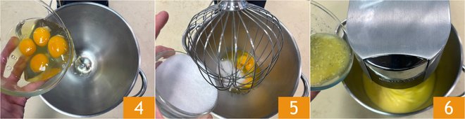 Place the eggs in the bowl of a stand mixer fitted with a whisk attachment 4, start it at medium-low speed and add the sugar 5. Increase the speed and mix for 2 minutes, then pour in the infused butter 6.