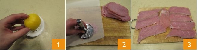 To prepare lemon scaloppine, start by squeezing the fruit to obtain the juice 1. Then cover the meat with parchment paper, so as not to tear the fibers 2, and beat using a tenderizer. Strike firmly but not too hard, to tenderize the tissues without tearing the pulp 3.