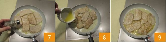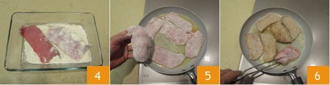 Coat the sliced veal in flour 4, remove any excess flour, then melt the butter on a low flame in a capacious pan and add the sliced veal. Turn up the flame and brown for a couple of minutes on one side 5 and then on the other 6.