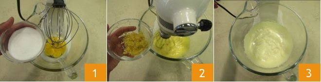 To prepare the lemon tiramisu, the first thing you need to do is make the ladyfingers. Separate the eggs (you'll need 1.7 oz of yolks and 3.3 oz of whites); transfer the yolks into the bowl of a stand mixer. Add half of the sugar slowly 1 and begin to beat the yolks and sugar at medium speed. As soon as they become foamy, add the grated zest of two untreated lemons 2 and continue to work them until they are well whipped 3.