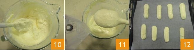 Gently mix until you obtain a smooth and foamy mixture 10; then transfer it into a pastry bag equipped with a smooth tip 11 and use it to create sticks approximately 3'' long on a baking sheet lined with parchment paper 12. With these amounts, you will obtain 20 sticks.