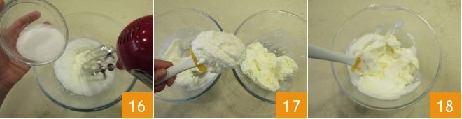 In the meantime, take care of preparing the lemon tiramisu cream. Firstly, transfer the mascarpone cheese into a bowl and work it with a spatula to soften it. Then, in another bowl, whip the fresh liquid cream together with the sugar 16. At this point, gradually add the whipped cream and sugar mixture to the mascarpone cheese 17 and mix with a spatula from the bottom to the top 18 to combine the two components.