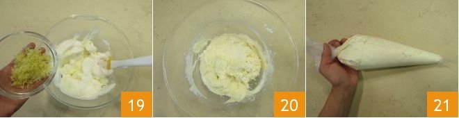 Then add the grated zest of an untreated lemon 19 and mix again to combine everything 20. Transfer to a disposable pastry bag without a nozzle 21 and refrigerate.