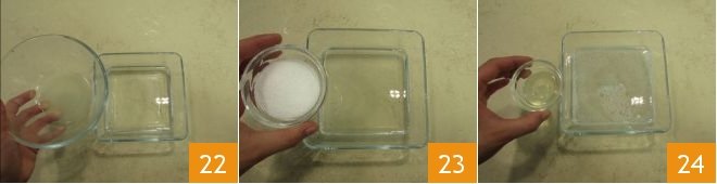 Now you can prepare the syrup for the ladyfingers: pour the lemon juice 22, sugar 23, and water 24 into a bowl. Mix everything together.