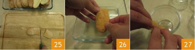 At this point, prepare 4 jars. If the ladyfingers are shorter than the jars, simply cut off a small piece 25 and use them to alternate with the layers of cream. Quickly soak the ladyfingers 26 and arrange them in a circular pattern, pressing them against the edge of each jar 27.