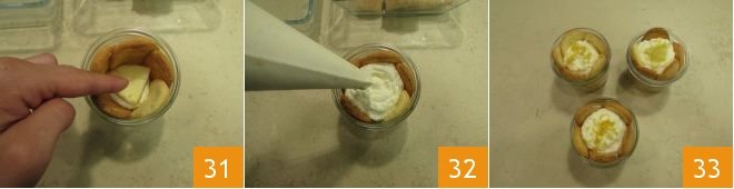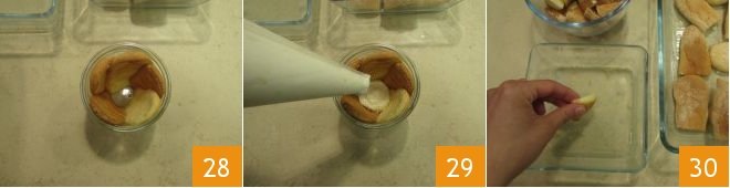 Once you have covered the entire inner rim 28, resume with the cream and pipe it into the center of each glass with a pastry bag until it is about half full 29. Lightly soak the remaining pieces of ladyfingers in the syrup 30