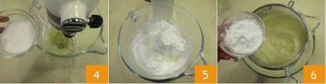 Keep the beaten egg yolks aside and whisk the 3.3 oz of egg whites, gradually adding the remaining sugar (4-5) when they have slightly swelled. Once finished, sift the flour 6 into the mixture with the yolks