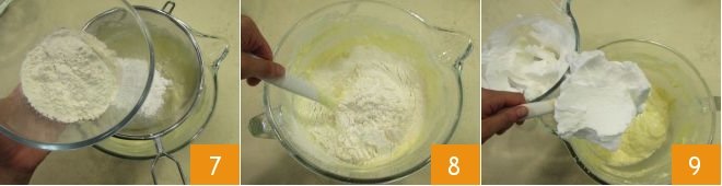 and the potato starch 7. Gently mix with a spatula from the bottom to the top 8, and as soon as you have obtained a lump-free mixture, add the whipped egg whites, always working gently with the spatula from top to bottom 9.