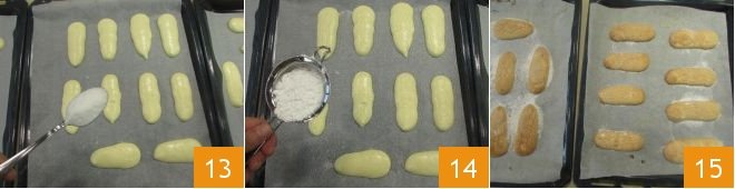 Dust each ladyfinger first with granulated sugar 13 and then with powdered sugar 14. Then bake the ladyfingers in a preheated static oven at 390°F for about 10-12 minutes. Once cooked, take them out of the oven 15 and let them cool completely.
