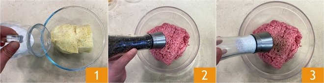 To prepare the lemon turkey meatballs, start by soaking the stale bread in milk in a bowl, allowing it to soften for a few minutes 1. Meanwhile, in another large bowl, add the ground turkey and season it with a grind of black pepper 2 and a pinch of salt 3.