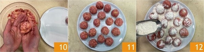 Take a portion of the mixture and form walnut-sized meatballs, rolling them between your palms 10, then place them all on a plate 11. Roll them in flour, coating well on all sides 12.
