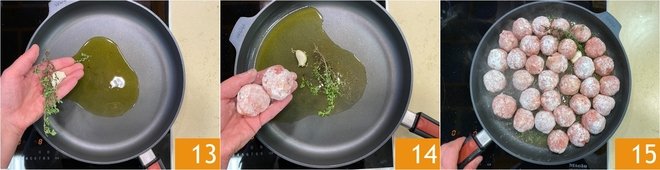 In a large pan, heat a drizzle of extra virgin olive oil with a crushed clove of garlic and a few sprigs of thyme 13. Once hot, place the meatballs in the pan 14 and let them brown over medium-high heat, turning them occasionally until golden on all sides 15.