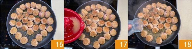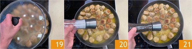 Cover the pan with a lid 19 and cook the meatballs on low heat for about 15–20 minutes until tender and well-cooked inside. Adjust with salt 20 and freshly ground black pepper 21 at the end of cooking.