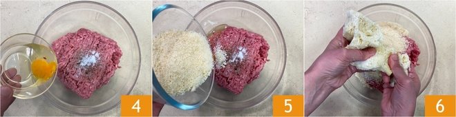 Incorporate a whole egg 4. Also add the grated Parmesan cheese 5, then incorporate the soaked and well-squeezed bread with your hands 6.