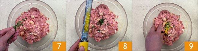 Season with some fresh thyme leaves 7 and grate the zest of one lemon directly into the bowl 8. At this point, mix all the ingredients with your hands until you obtain a homogeneous, soft but compact mixture 9.