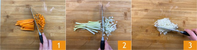 To make the lentil stew, start with the vegetable mixture. Trim the carrot and chop into cubes of around 1/8” (4 mm) 1. Do the same with the celery and onion 2. Next, chop the onion again to cut it into even smaller dice 3. Tie the aromatic herbs together with some string to form a small bunch.