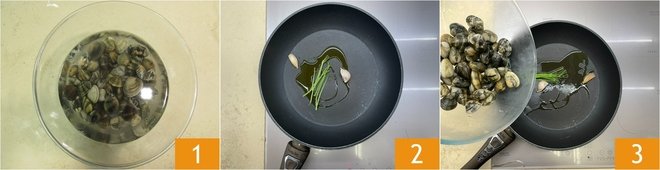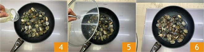 Deglaze with the white wine 4, then cover with a lid 5 and cook them for about 5 minutes until they are all open 6.