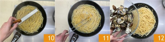 Finish cooking and add the grated bottarga 10. Mix well 11 and also add the clams 12.
