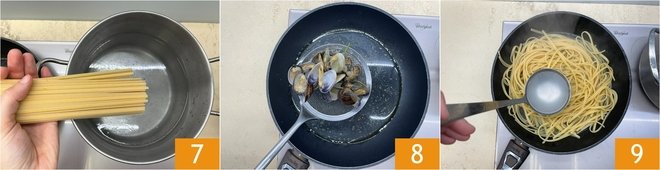 In the meantime, also cook the linguine 7. Using a slotted spoon, take the clams 8 and transfer them to a bowl, so as to keep the cooking water in the pan. As soon as the linguine is al dente, transfer it to the pan and add a ladle of cooking water 9.