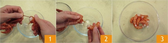 To prepare linguine with shrimp, zucchini, and saffron start by cleaning the red shrimp: detach the head 1, remove the shells 2 and extract the intestine, then set them aside in a bowl 3.
