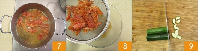 Once the bisque is ready 7, strain into a bowl or jug 8 and set aside. Now slice the zucchini into half-moons about 0.2 inches thick 9.
