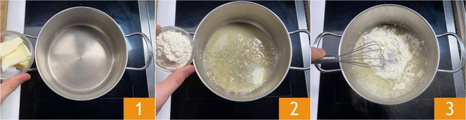 Pour in the hot milk 4, season with salt and pepper, and let the béchamel thicken while continuing to stir 5; it will take about 5 minutes. Let it cool and set aside. Clean and slice the leeks 6.