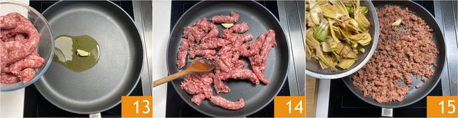 In a pan, brown a clove of garlic with a drizzle of oil. Add the sausage 13 and break it up with a spoon to get a texture similar to ragù 14. Once browned, add the artichokes to the pan 15, season with salt, and cook for about 7 minutes over medium-high heat, stirring often.