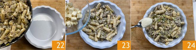 Transfer 2/3 of the pasta to a round baking dish 10 inches in diameter 22. Add half of the taleggio 23, then spread over a little more béchamel 24.