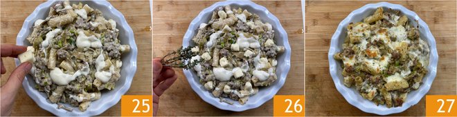 Cover with the remaining pasta, complete with the last pieces of taleggio, the remaining béchamel 25, and some thyme leaves 26. Bake in a preheated conventional oven at 480°F for 5 minutes, then continue in grill mode at 480°F for 3 minutes. Remove from the oven and let the macaroni pie with sausage and artichokes cool slightly before serving 27!
