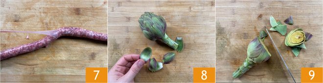 Remove the casing from the sausage 7, then proceed with the cleaning of the artichokes: remove the tougher outer leaves 8 and cut off the tip 9.