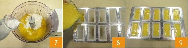 Blend well and, once the mango is reduced to a puree, add the almond milk 7. Blend again to mix all the ingredients well and then pour the mixture into 1.33 oz (70 ml) popsicle molds 8. Distribute the mixture in each mold, taking care to leave 1-2 millimeters from the inner edge of the mold 9.