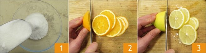 To make the marinated salmon, prepare the balanced salt by stirring the salt with the sugar 1: this is the base for the marinade. For the citrus version, cut an orange 2 and a lemon 3 into slices.