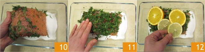 Place the salmon over it 10 and spread the aromatic mixture over it 11, followed by a few orange and lemon slices 12.