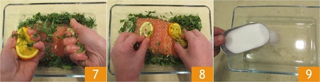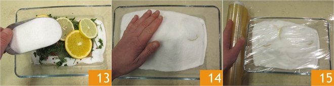 Add some more balanced salt 13 to fully cover the salmon, then press down on the surface with the palm of your hand 14 and seal with plastic wrap 15. Leave to marinade in the refrigerator for 24 hours.