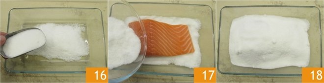 To make the beet and cuttlefish ink marinades, cover the bottom of a baking tray with the balanced salt 16, place the salmon slices over it 17 and cover with more balanced salt 18. Press the surface down with your hands, seal with plastic wrap and leave to rest in the refrigerator for 24 hours.