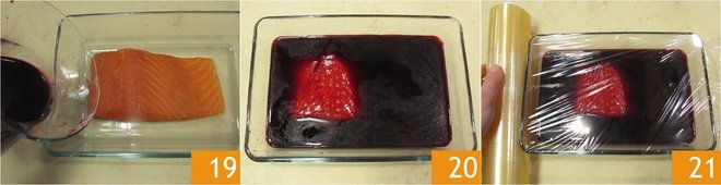 Once this time is up, rinse the salmon slices under running water. For the beet version, place a slice in another baking tray and add enough beet extract 19 to cover the fish entirely 20. Seal with plastic wrap 21 and leave to marinade in the refrigerator for 2 hours for a sweeter and more delicate flavor, or for 4 hours, for a stronger and more intense flavor.