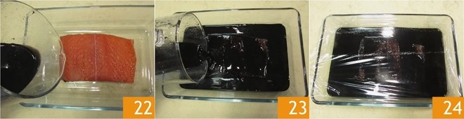 For the cuttlefish ink version, place the salmon slice in another baking tray and add the cuttlefish ink, previously diluted in water 22. Cover the fish entirely 23, seal with plastic wrap 24, and leave to marinade in the refrigerator for 5-6 hours.