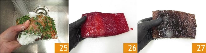 Once the marinating time is up, remove the citrus salmon from the balanced salt and rinse under running water 25. There is no need to rinse the beet marinated salmon 26 and cuttlefish ink marinated salmon 27: dabbing them will suffice.