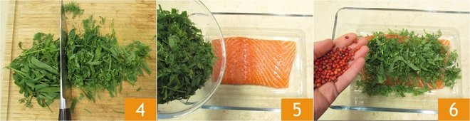 Finely chop the tarragon and the dill 4. Place the salmon slice in a container and cover with the finely chopped aromatic herbs 5 and a generous handful of pink pepper corns 6, then add the gin.