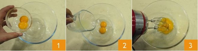 To prepare mayonnaise, place the yolks (from eggs at room temperature) in a deep bowl 1, add a few drops of lemon juice 2 and start lightly beat them with an electric whisk 3 on a medium speed, to give some body to the yolks.