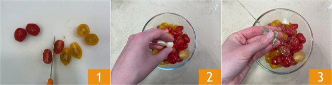 To prepare Mediterranean-style salmon fillets, cut the cherry tomatoes in half 1 and season them with 2 garlic cloves 2, salt, pepper, oil, and oregano 3. Mix well and set aside.