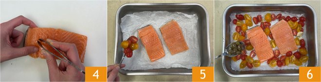Remove any bones from the fillets with the appropriate tweezers 4. Place them in a baking dish lined with parchment paper. Pour in the cherry tomatoes 5, olives, and desalted capers 6.
