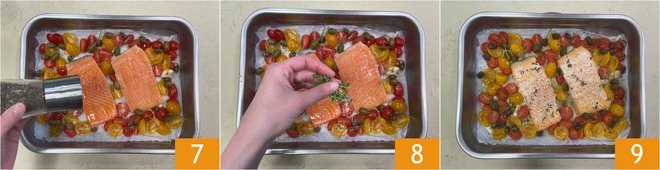 Season the salmon with oil, salt, and pepper 7, then add sprigs of dried oregano and fresh thyme all over the dish 8. Bake in a preheated static oven at 450°F for about 20 minutes. The Mediterranean-style salmon fillets are ready 9.