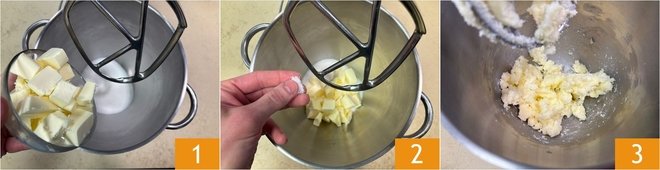 To prepare the mini baked cassatas, start with the shortcrust pastry: in the bowl of your stand mixer with the paddle attachment, add the sugar, butter cut into cubes (removed from the fridge 5 minutes earlier) 1, and a pinch of salt 2. Mix briefly to combine 3.