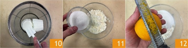 Now focus on the filling: drain the ricotta well, then sieve it into a bowl 10. Add the sugar 11 and grated orange zest 12.