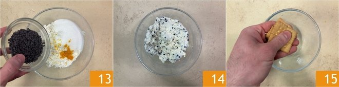 Add the dark chocolate chips 13 and continue mixing until a uniform cream is obtained 14. Place the mixture in the fridge until it's time to use it. Meanwhile, coarsely crumble the dry biscuits 15.