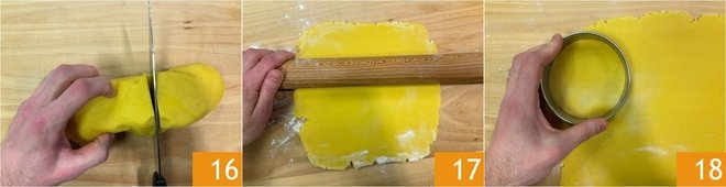 Take out the shortcrust pastry from the refrigerator, take 2/3 16, and roll out the pastry to a thickness of about 1/8 inch 17. Cut out 12 disks using a pastry cutter approximately 4.7 inches in diameter 18.