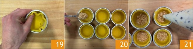 Butter and flour 12 molds with a diameter of 3.15 inches and line them with the pastry disks 19. Keep the scraps and a bit of pastry in the refrigerator to make the lids. Pour half of the crumbled biscuits on the bottom 20. Take the filling and transfer it into a piping bag without a nozzle, then squeeze it inside the baskets almost to the edge 21 and level it well with a spatula.