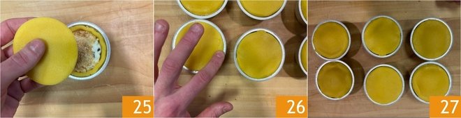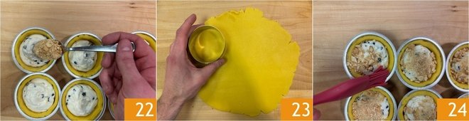 Place the pastry disks on top 25 and seal the edges well by pressing lightly 26. Before baking, or after about 10 minutes of cooking, prick the surface with a toothpick to allow steam to escape. Bake the mini cassatas in a preheated static oven at 350-355°F for about 35-40 minutes, placing them on the bottom shelf 27.
