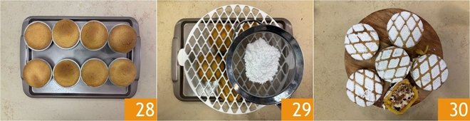Once baked 28, let them cool completely inside the mold. Finally, flip the pastries onto a serving tray, dust them with powdered sugar 29, and if you have a pie grid, use it as a stencil to create an elegant decoration. At this point, your mini baked cassatas are ready to be served 30.